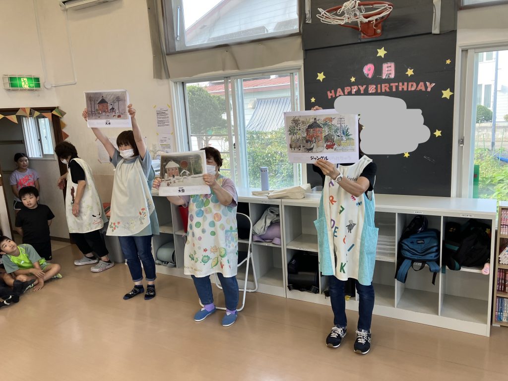 絵本「ねえどれがいい?」という究極の選択を自分で選んだり、誕生児さんが何を選ぶか予想するゲーム。例えば、家の外がこうなるなら?大水、大雪、ジャングル?ほとんどの子は大雪を選びました。水は溺れちゃうし、ジャングルは動物が家の中に入ってくるからなど。みんな自由に選んでみました。