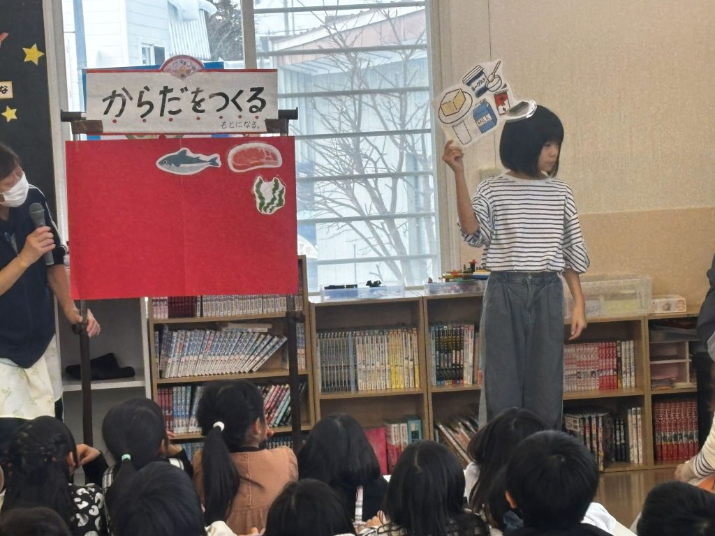 体を作りための食べ物はどんなものがあるかな?と聞かれるとピンとこない子が多かったのですが高学年のお姉さんたちがちらっとヒントを見せてくれると・・・