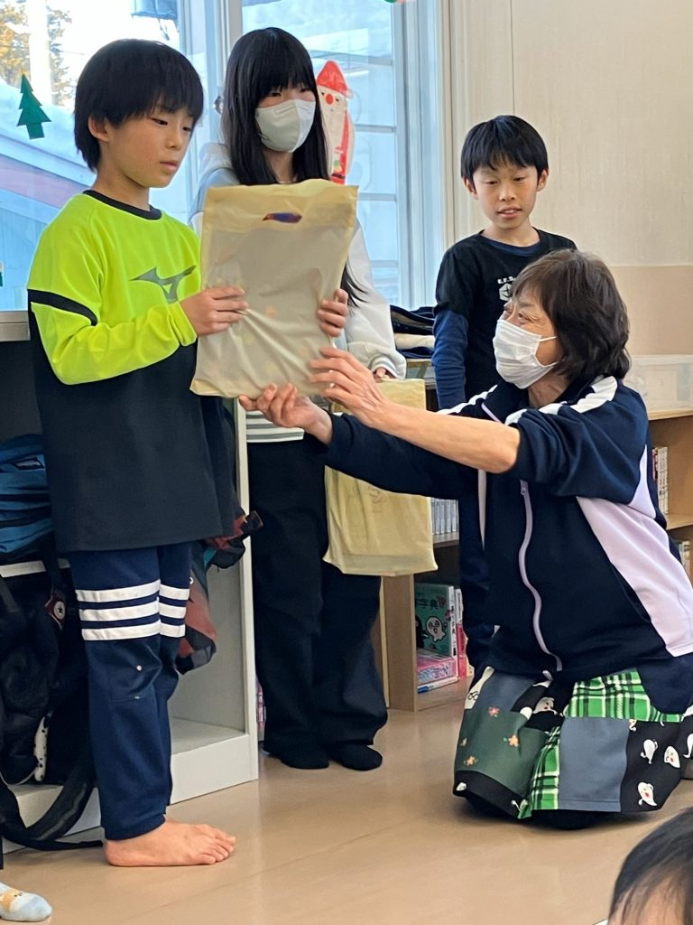 インタビューでは習い事や勉強などを頑張りたいと発表してくれたみんな。柏原先生からプレゼントをもらいました。