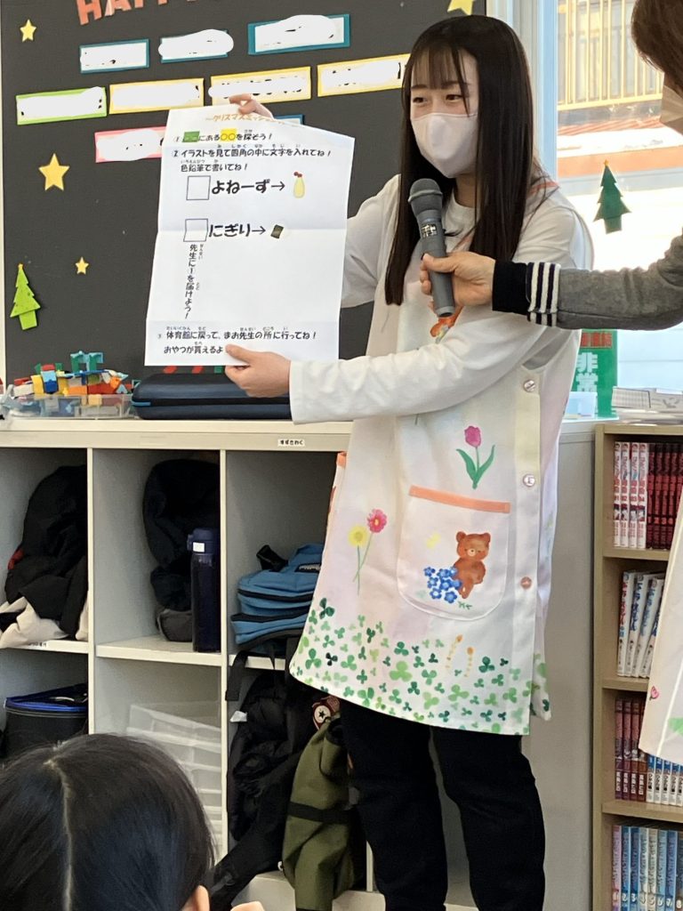今回はクリスマスカードを受け取り、書いてあるミッションをこなし、クイズを解いて、答えで、出てくる先生を探し、スタンプをもらってきて、最後に探したメダルの後ろに書いてある数字と同じ番号のおやつをもらうというゲームです。
